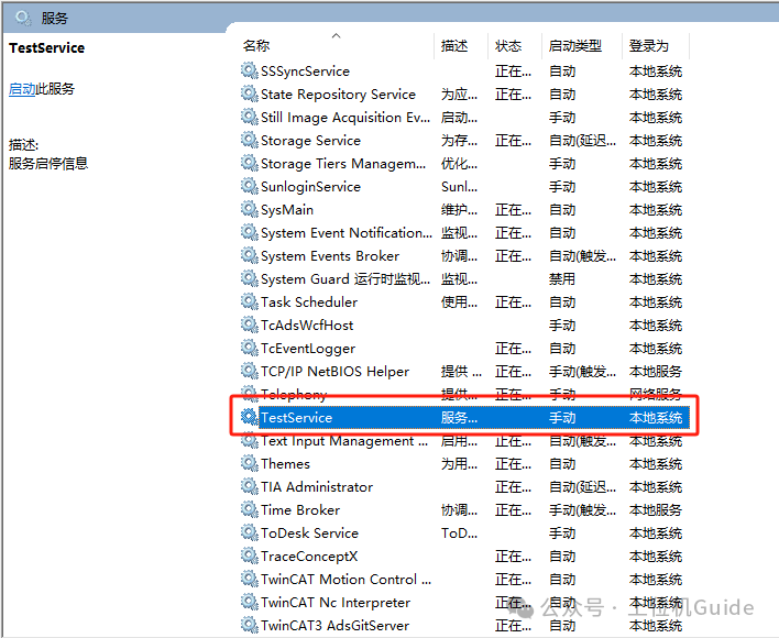 打开服务,可以看到TestService这个名称的服务已经安装完成,