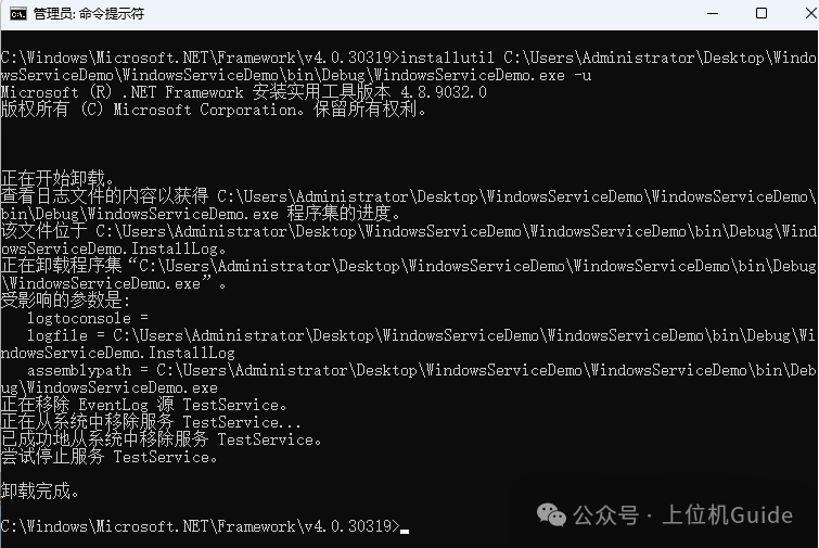installutil C:\Users\Administrator\Desktop\WindowsServiceDemo\WindowsServiceDemo\bin\Debug\WindowsServiceDemo.exe -u