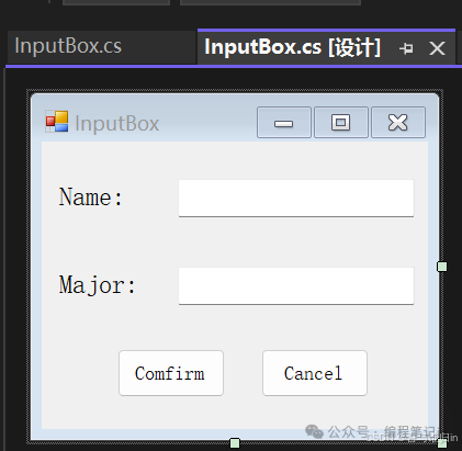 public ValueComfirmChanged OnValueComfirmChanged;public InputBox(){    InitializeComponent();    this.CenterToParent();}private void Btn_Comfirm_Click(object sender, EventArgs e){    OnValueComfirmChanged?.Invoke(thisnew Student(Tbx_Name.Text,Tbx_Major.Text));}private void Btn_Cancel_Click(object sender, EventArgs e){    Tbx_Name.Clear();    Tbx_Major.Clear();    this.Hide();}