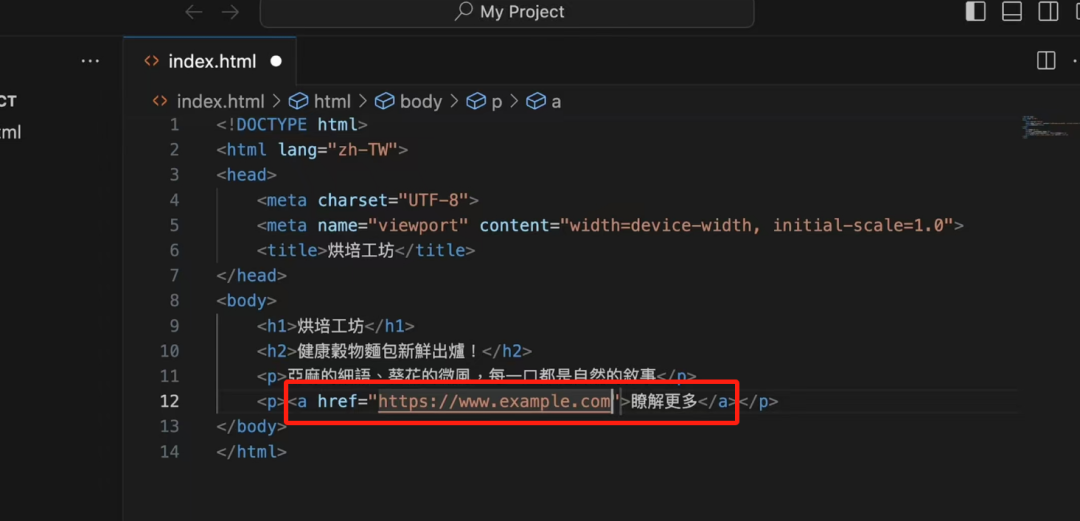 或是当前目录中的某个网页,由于当前这是你手写的第一个网页,还没有建立其它的页面,所以这里暂时 href="#" 就ok了