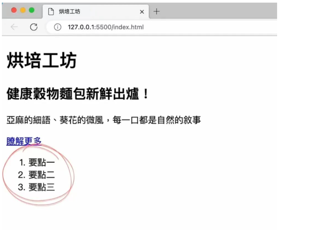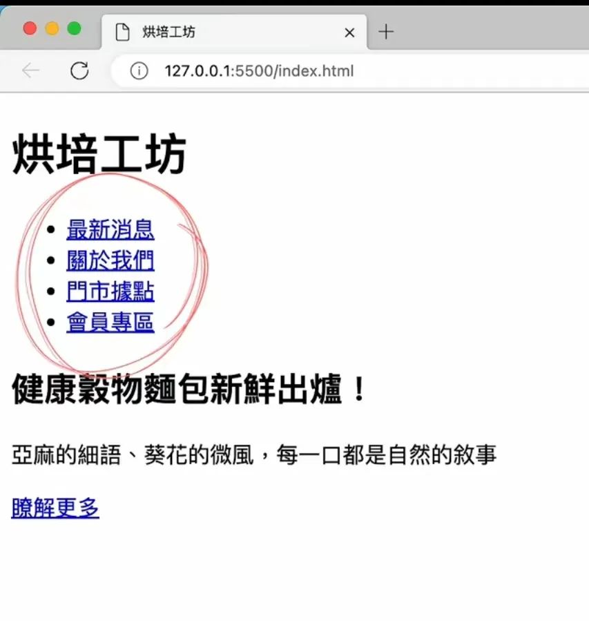 由于导航栏的前方不需要任何数字编号,这时选择用<ul>标签更为妥当。<ul>标签的用法和<ol>相同,唯一差异就是前方没有数字编号,而是一个小黑点。