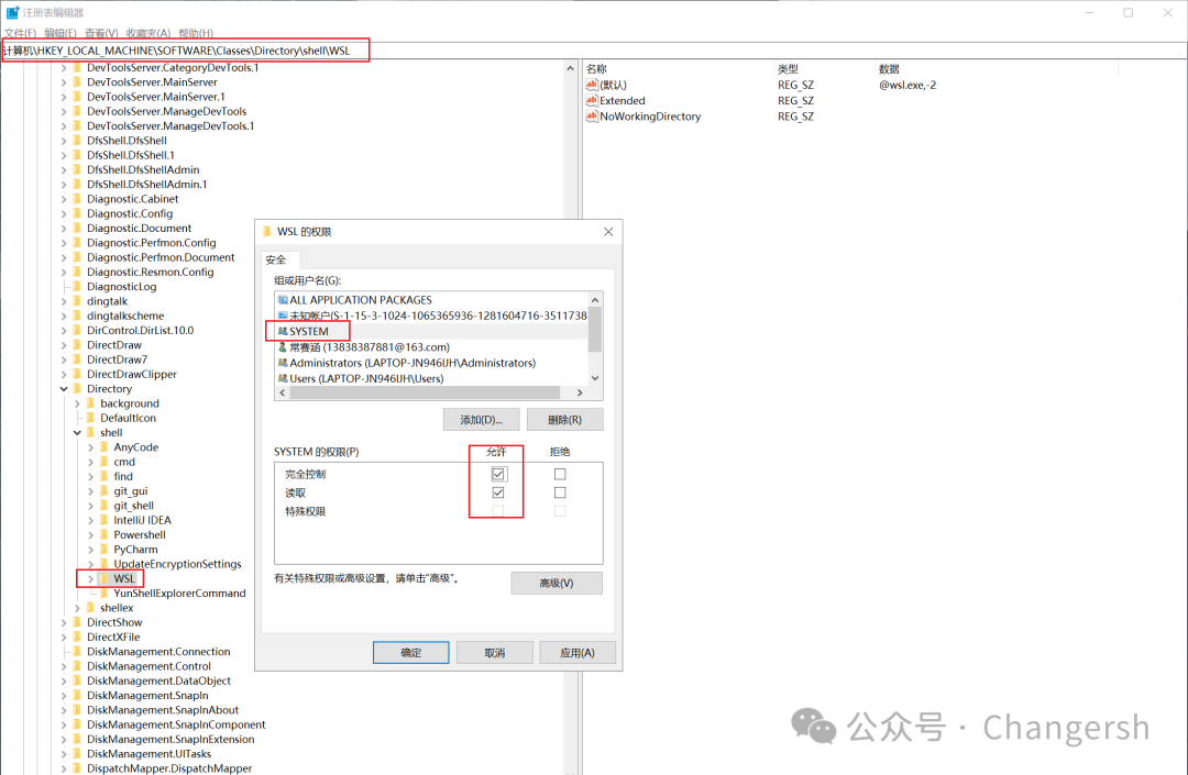 打开注册表编辑器,找到计算机\HKEY_LOCAL_MACHINE\SOFTWARE\Classes\Directory\shell\WSL,右键“权限”,选中“SYSTEM”用户,加上“允许完全控制”的权限。