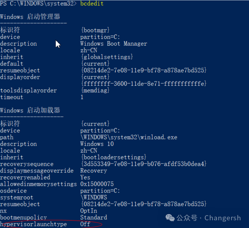 2. 还是不行?在命令行powershell看:bcdedit主要还是最后这个没打开,hypervisorlaunchtype = off