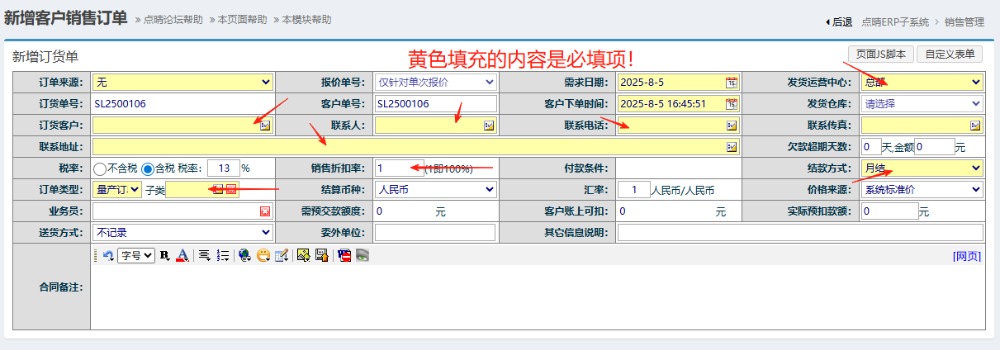 2.按照要求填写对应的信息和资料,尤其留意图中红色箭头和必填的部分(订货客户、需求日期、销售折扣率、合同编号)一定要填好!
