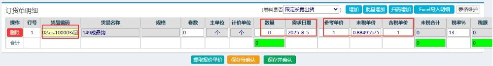 3.订单货物明细要确认好货物单价、数量以及货品编码(特别注意!),保存并确认!