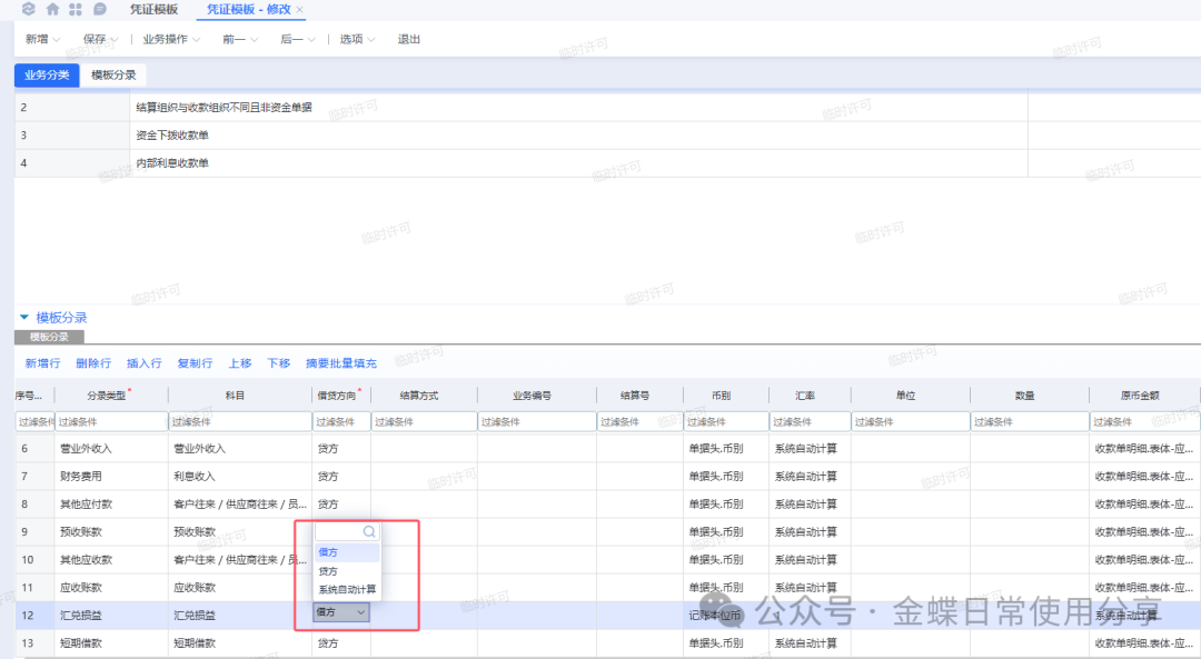 ① 可以理解为对单据的业务细分,不同的业务分类可以设置不同的模板分录。单据上的表头字段均可以作为业务分类的判断依据(注意不仅仅是单据类型字段)。通过业务分类,可以覆盖一种来源单据承载的多种应用场景。