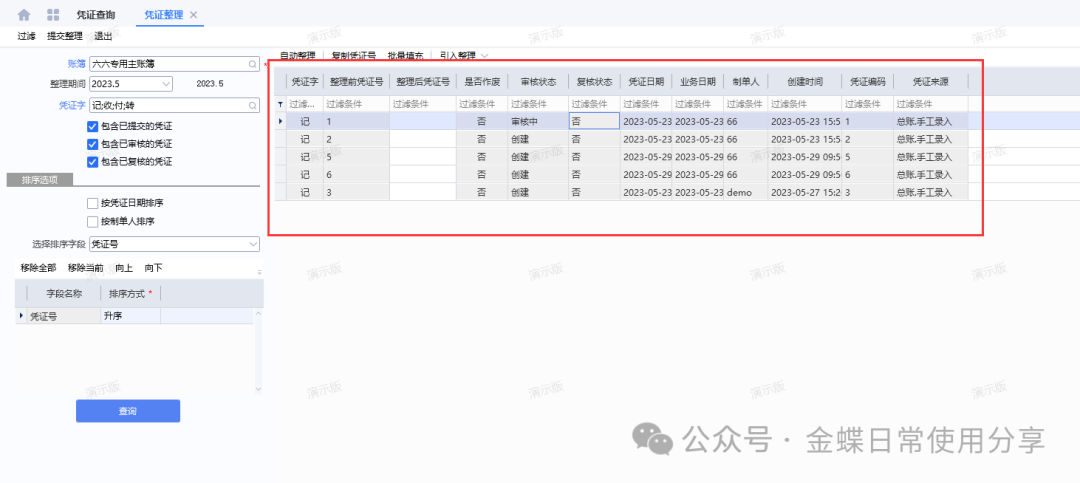 1)、自动整理:点击“自动整理”,系统将自动将当前的过滤出来的凭证列示数据自动生成【整理后的凭证号】,用户可以手工修改调整,如果确认无误之后,点“提交整理”即可。