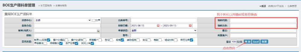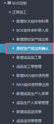 :点晴ERP-BOE原材发产线出库流程![]() 1.进入ERP系统之后,在左侧功能菜单里找到“BOE定制”,点击“正常加工”,找到“新增原材发产线出库”。