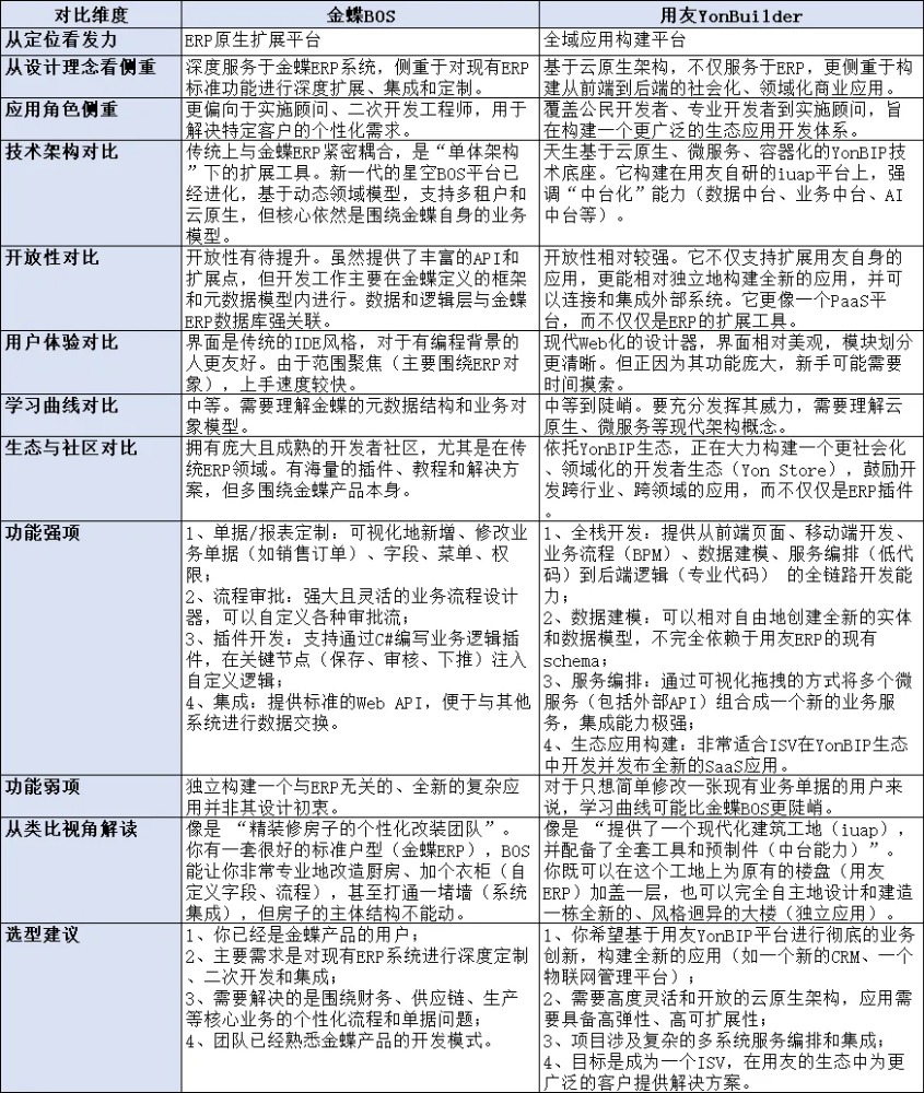 金蝶BOS与用友YonBuilder开发平台对比