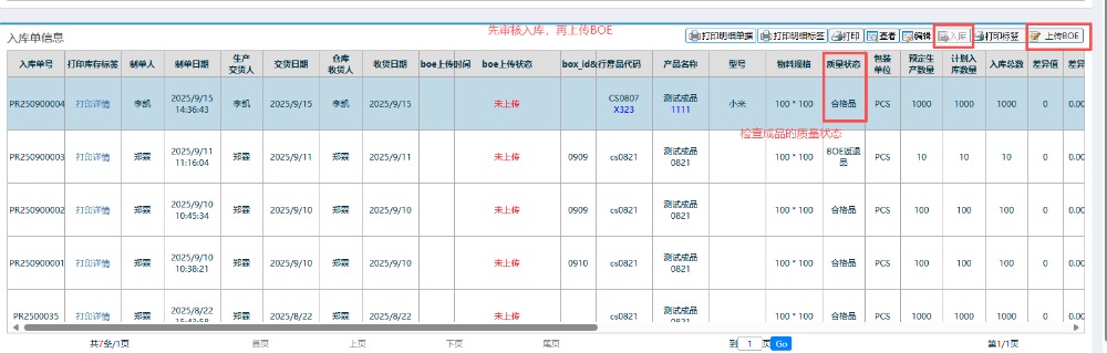 7.接下来就是进行入库的操作:先入库,再上传BOE。同时检查下成品的质量状态。