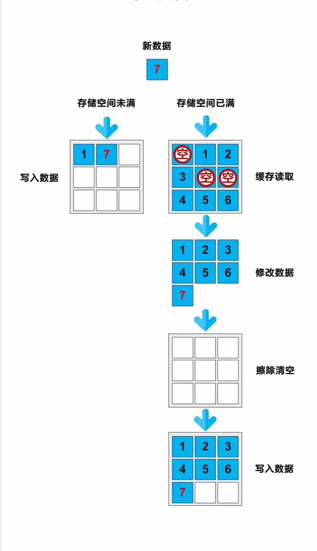 当固态硬盘的存储空间没有被全部写过一遍数据时,新写入的数据会直接写入;当固态硬盘的存储空间已经被全部写过一遍数据时,再写入新数据就会先“缓存”后“擦除”再“写入”,这就是写入放大