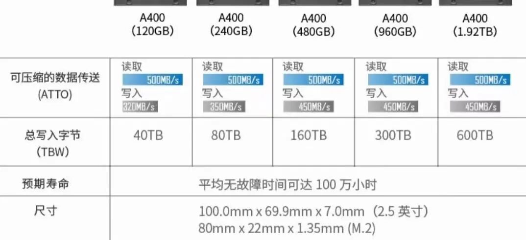 笼统的判断固态硬盘的使用寿命可通过“TBW”参数来判断,不同厂家因“存储芯片质量”、“写策略”等不同,同容量的固态硬盘的BTW也可能不同: