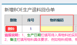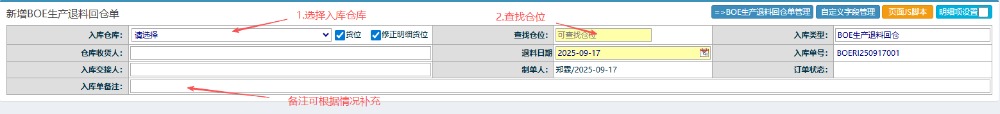 1.进入ERP系统之后,在左侧的功能菜单里找到“BOE定制”,点开“原材退料”,点击“新增生产退料回仓单”。