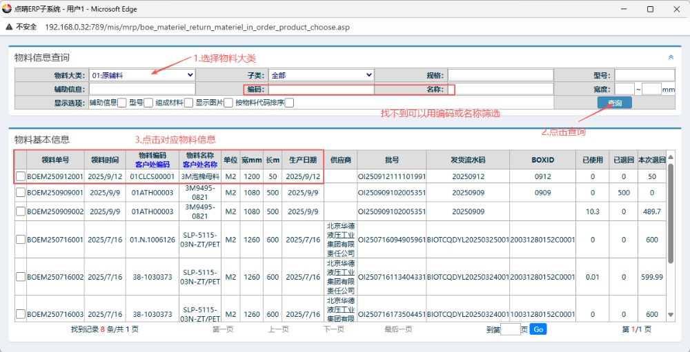 按图操作,在弹出的信息窗口中点击选择物料大类,点击查询,然后点击对应的物料信息