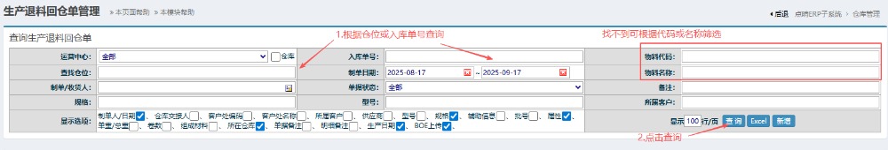 6.进入界面后,按图操作:根据入库单号或者仓位查询,如果都找不到可以用代码或者名称筛选,然后点击查询