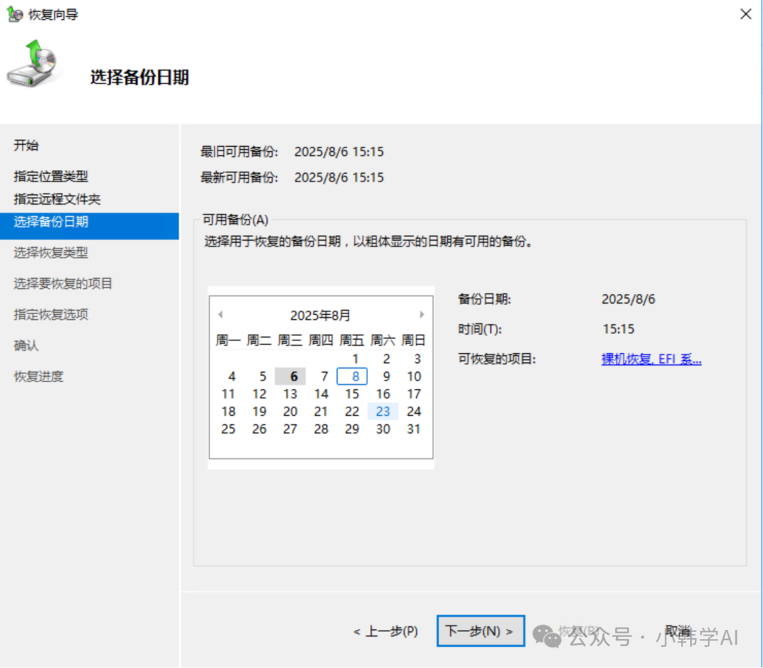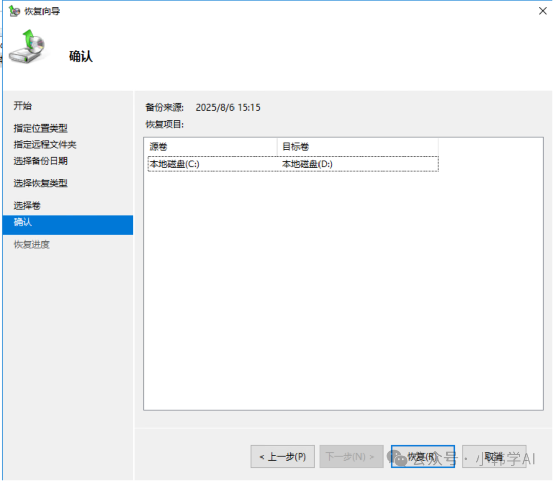 安装window server backup功能模块windows server默认安装没有backup 模块,需要安装功能模块选择本地所在地,本机或者网络共享目录,我这里之前备份在网络共享目录下我这里选择把备份中的C盘分区卷,恢复到这台机器的d盘这种恢复方式无法恢复EFI引导分区,我们需要重建EFI分区如果你的需要恢复的硬盘已经有了efi分区,那么执行以下命令重建引导文件bcdboot d:\windows /s S: /f ALL