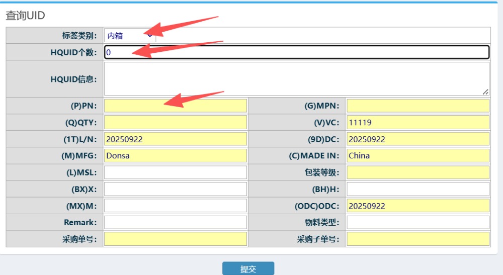 进入界面后,选择内箱或者外箱,输入绑定标签个数,选择对应的单号以及必填内容