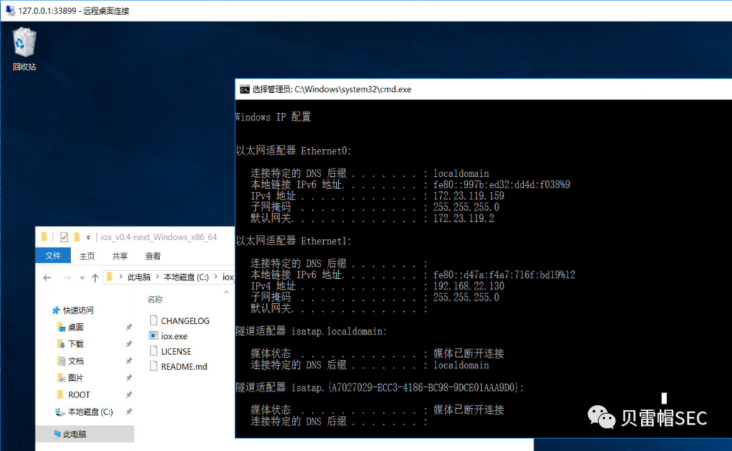 Options:  -l [*][HOST:]PORT      address to listen on. `*` means encrypted socket  -r [*]HOST:PORT      remote host to connect, HOST can be IP or Domain. `*` means encrypted socket  -k HEX      hexadecimal format key, be used to generate Key and IV  -u      udp forward mode  -t TIMEOUT      set connection timeout(millisecond), default is 5000  -v      enable log output  -h      print usage then exit        C:\iox_v0.4-next_Windows_x86_64>iox.exeiox v0.4     轻松访问内网(https://github.com/eddieivan01/iox)