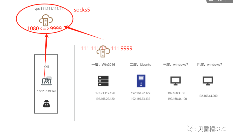 可以看到客户端将请求给vps 的1080端口,然后通过socks5隧道转发给内网第二层网络。