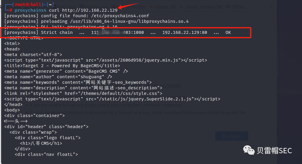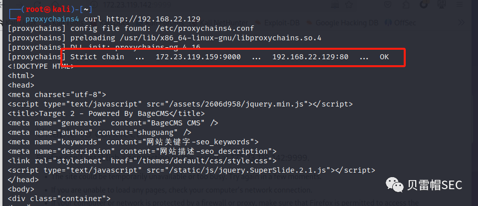 3、kali 配置socks5客户端进行测试,成功访问到第二层网络主机