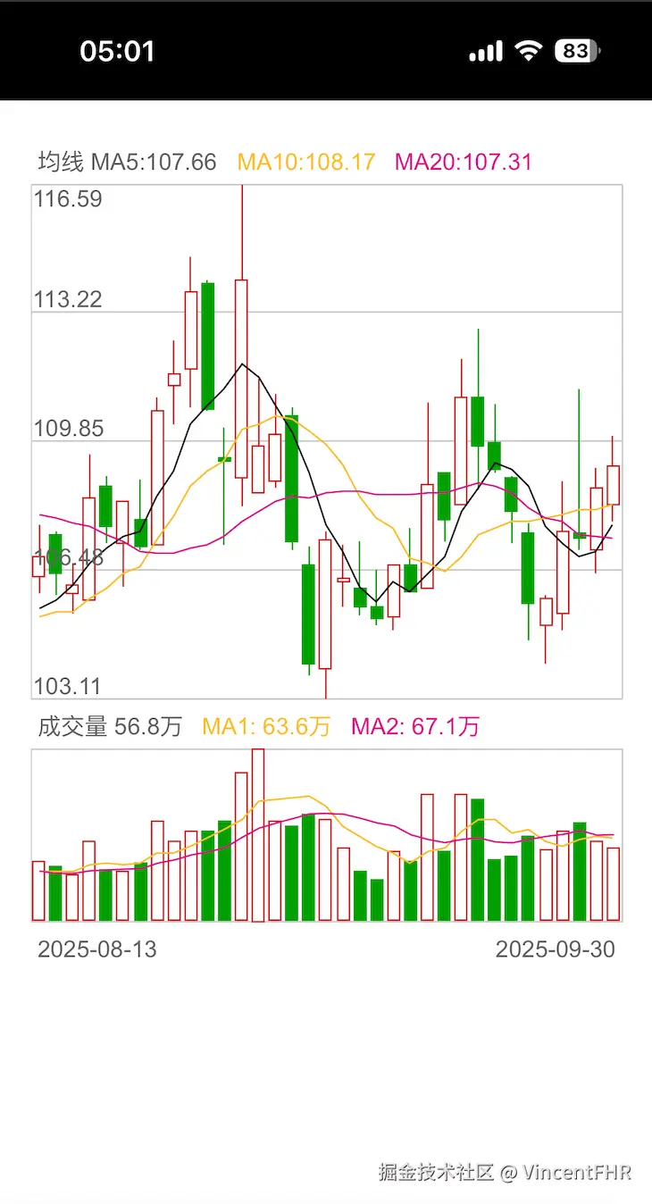 从上面的图可以看出, 需要画 5日均线、10日均线、20日均线, 成交量快线(10日)、成交量慢线(20日) 但是, 接口没有给出当日的均线值, 需要自己计算。