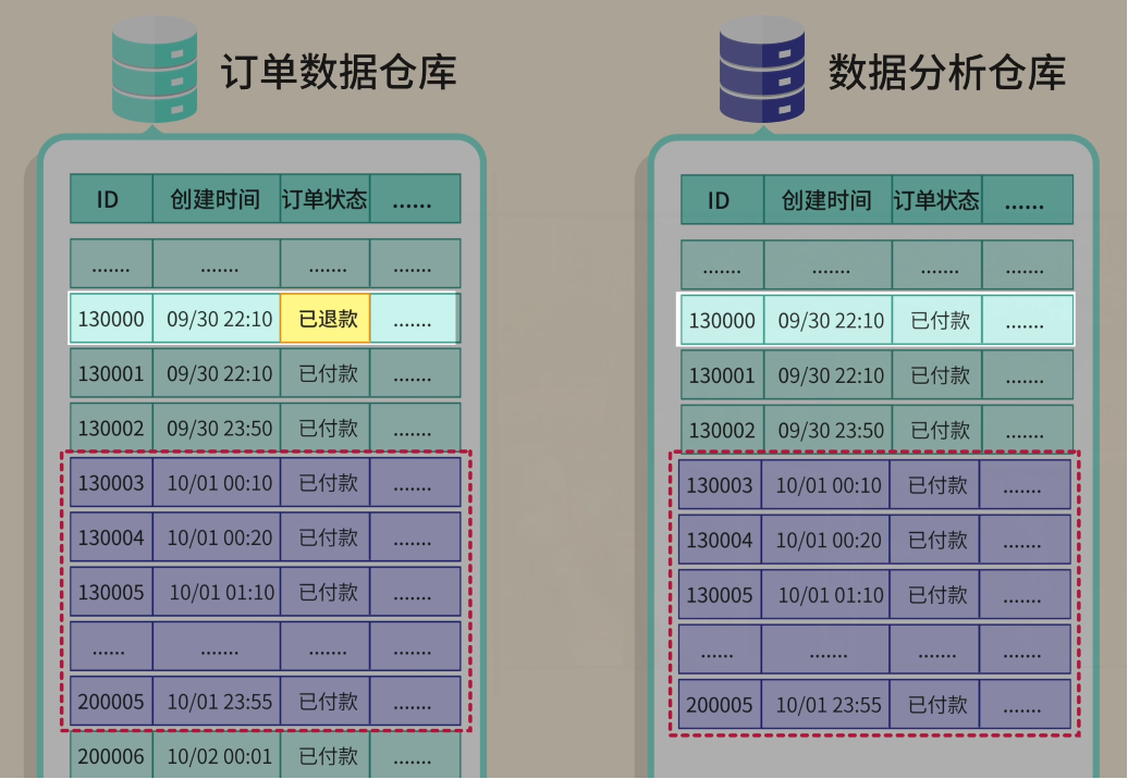 全量同步什么是数据同步呢?就像你有两个手机,要把其中一个手机的照片复制到另一个手机里。数据同步就是把一个数据库的数据,定期复制到另一个数据库里。 你心想:这还不简单吗?我写个定时任务,每天 把整个订单表的数据 全部查出来,然后 一股脑插入 到数据仓库! ![]() 这种方法叫 全量同步,不管数据有没有变化,每次都把所有数据重新复制一遍,简单粗暴。 第一天,公司有 1 万条订单数据。你的程序跑了 3 个小时,同步成功! 老板看着数据夸到:不错啊小阿巴,开发神速啊! ![]() 你内心暗爽:高端的功能往往只需要最简单的代码。 ![]() 基础告警第二天一早,你还没到公司,就收到了运营小姐姐的夺命连环 call:“小阿巴!出大事了!昨天晚上的数据同步失败了,现在老板还没看到昨天的数据,他正在会议室发火呢!” ![]() 你意识到:现在的程序是不可靠的,如果因为网络等原因同步失败了,可能要到第二天才会发现。 于是你给程序加了一段逻辑:如果同步失败,会记录错误日志,同时发邮件通知管理员,并且把数据库回滚到同步前的状态。 ![]() 这样如果出了问题,你会比老板先发现,手动重新执行一遍同步任务就好。 增量同步过了几天,老板黑着脸找你了:“小阿巴,为什么今天数据还没同步完?” 你看了下订单数据,立刻发现了问题。现在有 10 万条数据,程序跑了 30 个小时还没结束;这样下去,如果有 100 万条数据,估计要 300 个小时! 老板:少废话,快点解决,不然送你到隔壁餐饮部沉淀沉淀。 ![]() 你开始思考:既然全量同步太慢,那我只同步每天新增的订单不就行了? ![]() 这就是 增量同步,约定每天 0 点执行同步任务,只同步昨天 0 点之后创建的订单。 ![]() 这样大大减少了每次同步的数据量,任务的执行时间不再线性增加了。 但很快,你发了一个问题,订单的状态是会发生变化的,比如用户付款后又退款。 如果使用订单创建时间作为增量同步的分界标志,只能同步新增的订单,但是订单状态的更新不会同步! ![]() 于是,聪明的你使用 updated_time 字段进行增量同步,这个字段会在每次数据变化时自动更新。 ![]() 这样新增和修改的数据都能同步了! 你内心窃喜:聪明如我小阿巴,老板夸我好开发。 ![]() 批处理过了几天,公司搞了一波大促活动,当天订单量比平时多了几倍,老板请大家通宵狂欢开 party。 结果正在你欢唱 “只因你太美” 的时候,突然公司的运维大叫:不好了不好了,我们的项目服务器卡死了,用户无法下单! 你看了看时间,0 点多,不正是数据同步任务的执行时间么?你瞬间汗流浃背,放下麦克风,赶回公司修 Bug。 原来是因为一次查询出来的订单数据太多了,都加载到内存,导致服务器 OOM 内存溢出了。 ![]() 你悔不当初:唉,早该想到这个问题,既然单次处理数据量太大有风险,那我就 分批处理。 每 100 条数据为一批,每次只从数据库中分页查询出这一批数据,同步完这一批,再执行下一批。 ![]() 这样每次只处理少量数据,内存压力小;而且如果某一批处理失败,只需要回滚和重新同步这一批,而不是全部重来。 问题算是解决了,但是今夜你彻夜难眠,你似乎成了公司业务增长后,唯一不开心的那个人。 ![]() 希望今后不会再遇到这种闹心事了吧。 游标机制但生活总是这样,屋漏偏逢连夜雨。两天后,你又收到了老板的咆哮:“狗阿巴,这就是你做的数据同步?你自己看看丢了多少数据!” 你大惊,丢失数据?不应该啊。。。 经过仔细排查,你发现了问题:如果在分页查询的过程中,有新的数据被插入或更新,就会导致数据偏移和丢失! 比如查询第 1 页时,符合条件的订单有 4 条: 执行第 1 页查询,每页 2 条,偏移量为 0: 查询结果返回订单 A(08:00)和订单 B(09:00),同步完成后将偏移量调整为下一页 可就在查询下一页前,订单 B 因为 “修改订单状态” 被更新,这时订单 B 的更新时间就不在查询范围内了。 这就导致查询下一页 ![]() 怎么解决这个问题呢? 这可难不倒你小阿巴,既然 动态数据集 中使用 SQL 自带的 OFFSET 偏移作为分页起点会出问题,那不妨 自定义一个标志来记录下一批要同步的起点。 这就是游标机制。 比如我约定自增的主键 id 作为游标,每查询一批数据之后,把这批数据的最后一条记录作为新的游标值;查询下一批数据时,只查询 id > 游标的数据。 ![]() 这样不仅防止数据丢失,还避免了 OFFSET 深度分页带来的性能问题。 此外,如果把游标想象成进度条的断点,可以更清晰地记录同步进度,失败后可以从断点继续。 做完这一通优化后,你长吁了一口气,工作看来是保住了。 ![]() 性能优化你以为终于可以安稳一段时间了。但没想到,公司的好日子才刚刚开始。 随着老板大力扩张业务,公司每天的订单量可以达到百万条,你的同步任务每次要跑几个小时才能完成。 更要命的是,老板现在对数据的依赖越来越强,要求每隔 2 个小时就要同步一次数据! 怎么能够让任务执行更快呢? 这时,你想起了曾经在 程序员面试神器 - 面试鸭 上背过的各种性能优化八股文。好家伙,终于能派上用场了! ![]() 首先,修改插入数据库的操作方式。之前是一条一条地插入订单数据,改为执行一条批处理语句来同时插入同一批内多个订单数据,减少了跟数据库通信的次数,性能大幅提升。 ![]() 但是你觉得还不够快,于是优化了批处理的流程。之前是等一批同步完再同步下一批,串行执行;现在你启动了多个线程,每个线程负