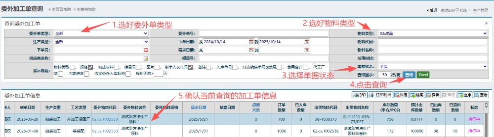 2.进入页面后,按图操作:选好委外单类型、物料类型以及单据状态,然后点击查询。在下方得到当前确认的加工单信息。