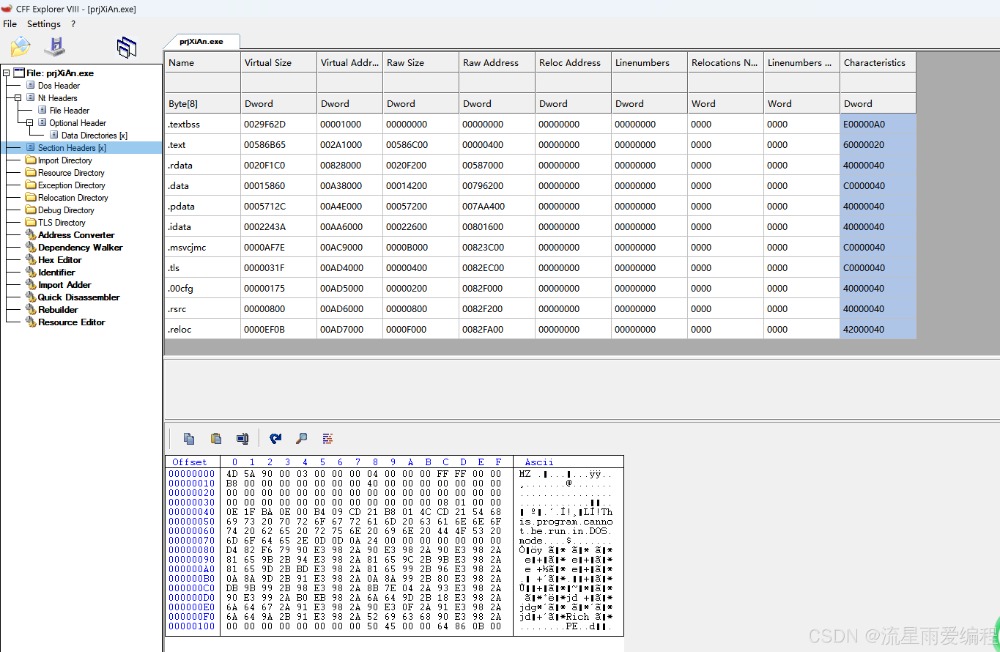 启动 CFF Explorer 后,主界面左侧是一个树形导航栏,右侧是详细的十六进制和结构视图。