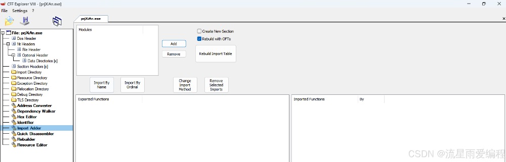 • 添加导入函数:这是 CFF Explorer 的杀手级功能。它允许你轻松地为程序添加一个新的 DLL 和其导出函数。