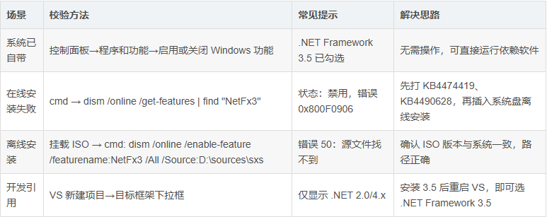 .Net Framework 3.5 的典型场景:医院 HIS、银行柜员、工厂上位机、学校考试客户端、古董级 ERP、财务开票软件,全是 .NET 3.5 高峰期的产物,源码丢不了,换框架成本高,只能继续抱着跑。 和 .Net Framework 3.5 同领域的主流软件有 Java 和 .NET 6/8,Java 跨平台强,但桌面 GUI 丑到哭;新版 .NET 性能炸裂,可老程序迁移要改代码。相比之下,3.5 的优势只有一条:老代码零改动直接跑,老板省钱,员工省心,缺点是只限 Windows。 下载.NET Framework 3.5安装.NET Framework 3.5