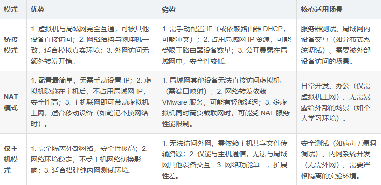 VMware 三种核心网络模式分别是桥接模式NAT 模式仅主机模式,核心差异在于虚拟机与主机、外部网络的连通性。