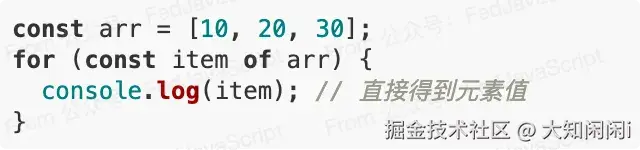 const arr = [10, 20, 30];arr.customProp = "hello";for (let i in arr) {console.log(i, arr[i]); // 会输出 "customProp" "hello"}